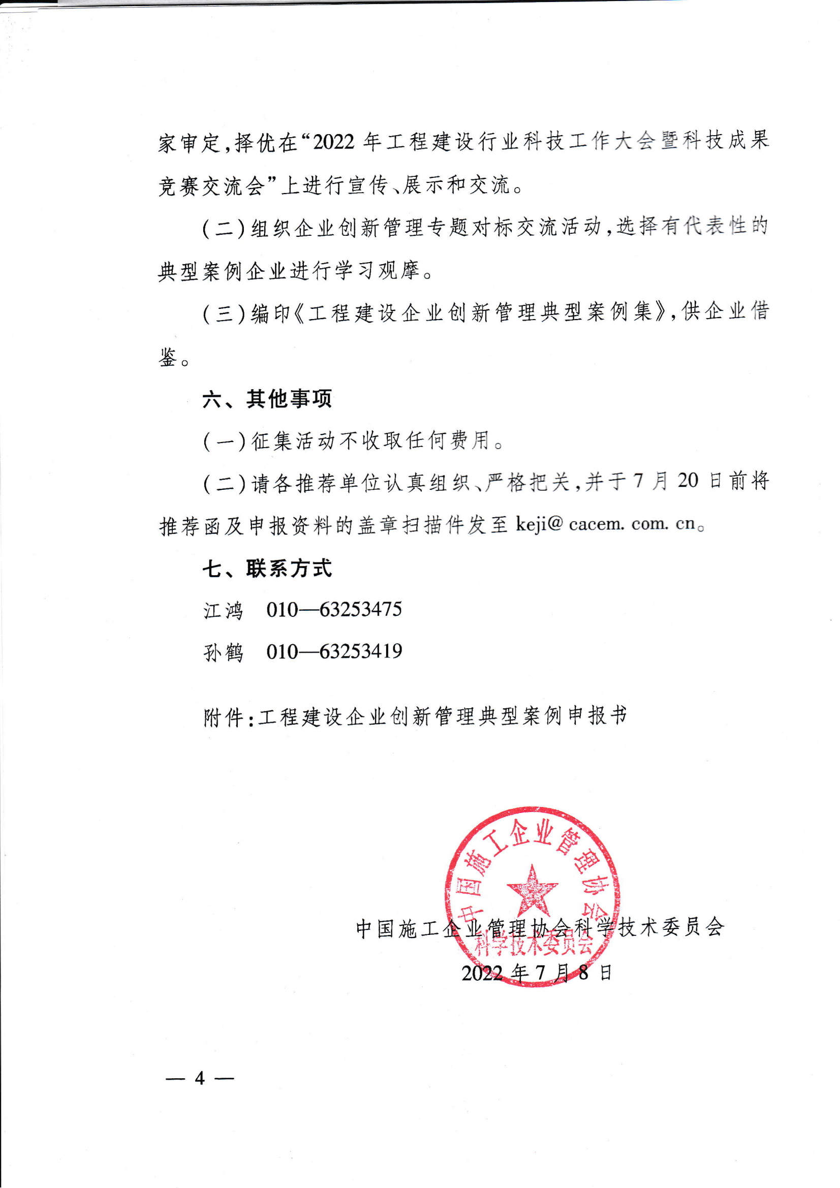 請(qǐng)各申報(bào)單位根據(jù)通知要求進(jìn)行申報(bào),并將加蓋企業(yè)公章的《工程建設(shè)企業(yè)創(chuàng)新管理典型案例申報(bào)書》掃描件及可編輯版報(bào)送至我會(huì)行業(yè)發(fā)展部(郵箱:416997982@qq.com),截止申報(bào)時(shí)間為7月20日前。