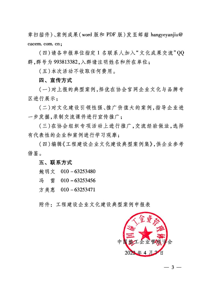 請申報單位按照通知要求于5月30日前完成申報工作。請將申報材料報送至通知中指定的郵箱,將案例申報表紙質(zhì)版郵寄至我會行業(yè)發(fā)展部,我會將統(tǒng)一推薦。聯(lián)系人:胡宇、田浩,聯(lián)系電話:025-83312695。
